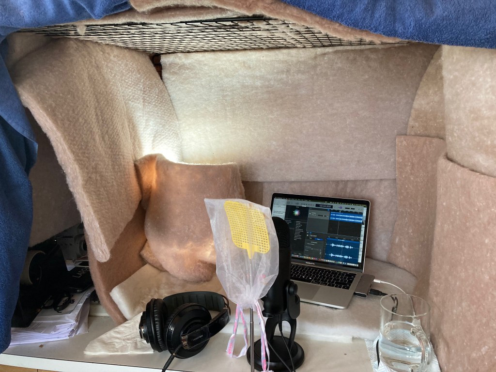 It’s rather primitive! I’ve arranged some insulation material around a fire guard that sits rather neatly on top of my workbench, and my anti-plosive shield is a strategically-placed flyswatter with additional nylon mesh … oddly enough, it seems to work! Garageband 10.4.2 on my MacBookPro laptop, and a Blue Yeti microphone, along with recording headphones which I find much more useful than I thought I would. And then, after achieving what I hope are appropriate settings for ACX studios, thanks to Rob Dircks’ kind blog entries, and working just a little bit on my reading and microphone technique, I feel as if I’m ready to rock and roll into the rest of the Prequel.