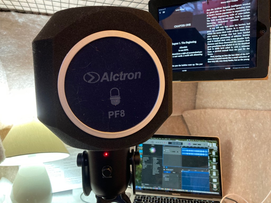 Placement of an iPad at eye-level, with the laptop running the Garageband recording software, means that I can position the microphone about two inches from my mouth, and read intimately for the listening pleasure of my audience, with a much-reduced gain in the software. The whole approach is meant to eliminate any ‘effects,’ and to provide a listening experience that is as close as possible to the real thing.
